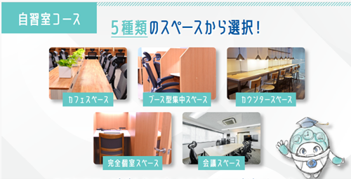 席数はもちろんのこと、豊富な学習設備をご用意して、お越しいただいた方が最も集中できる環境を整えております。例えば、他店にはめずらしい音読学習が可能な個室スペースや、フリードリンクコーナーを完備しております。また、最新AIを用いた学習サポートもあり、24時間365日質問可能なプランなど、「場所」の提供にとどまらず、皆さまの学習をすべての面からサポートいたします。